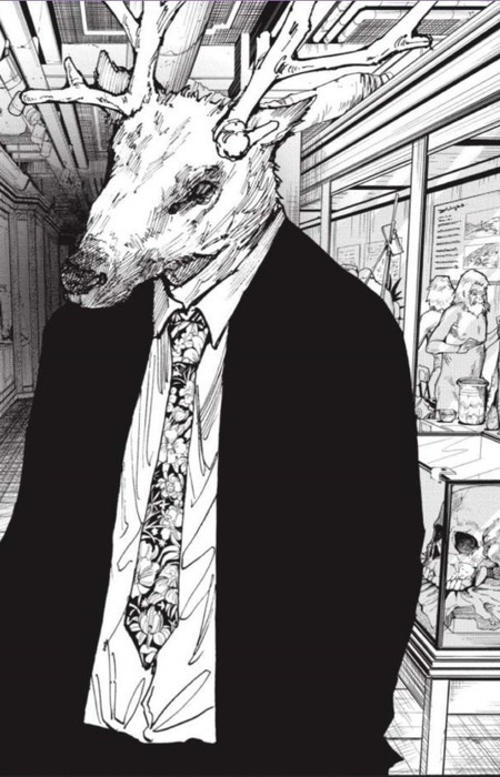 Kashima is a relatively tall man who, in all his appearances, wears a black business suit with a floral-patterned tie and a realistic reindeer head. When preparing for combat, he takes off his head.